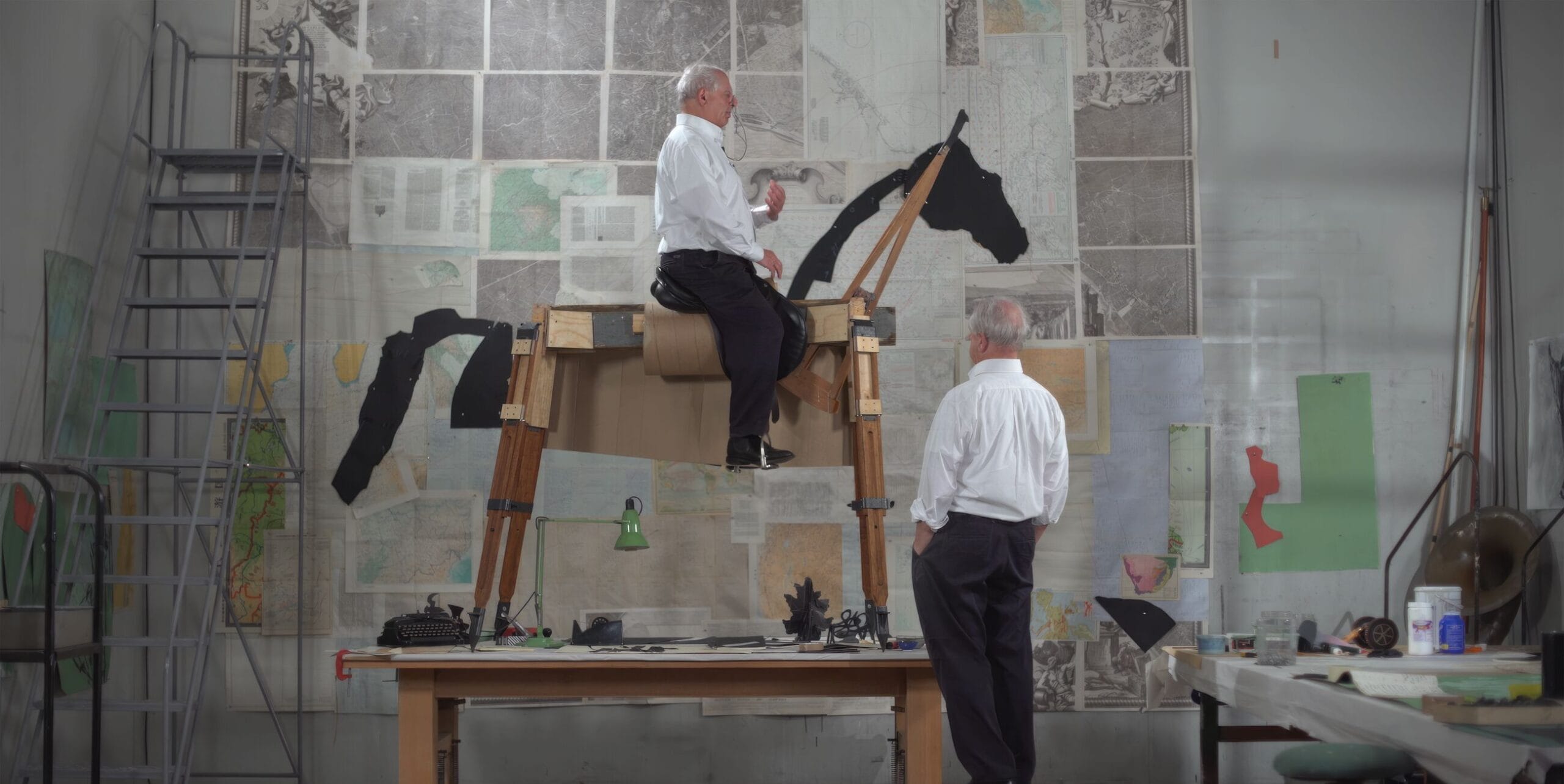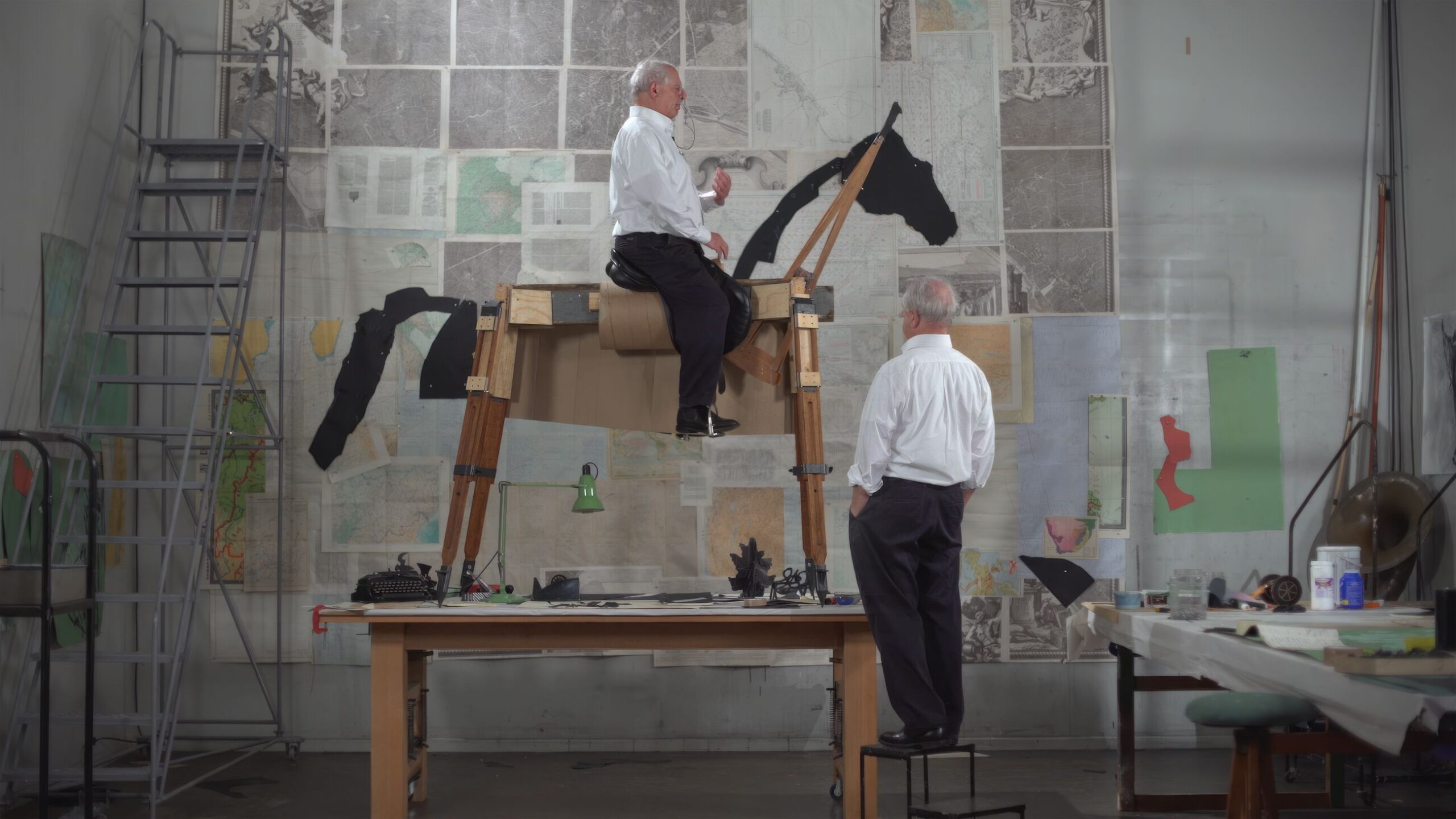 Kentridge pinta con pinceladas curvas negras que, desde un punto de vista específico, forman la silueta de un caballo. Debate con su doble, que se sienta sobre un alto caballo de madera, y colabora con su equipo en una gran escultura abstracta.