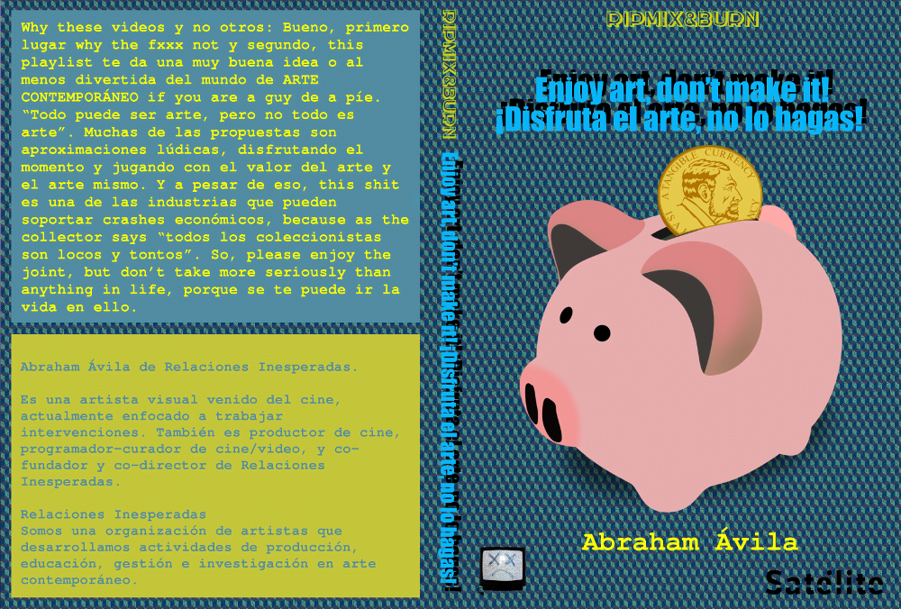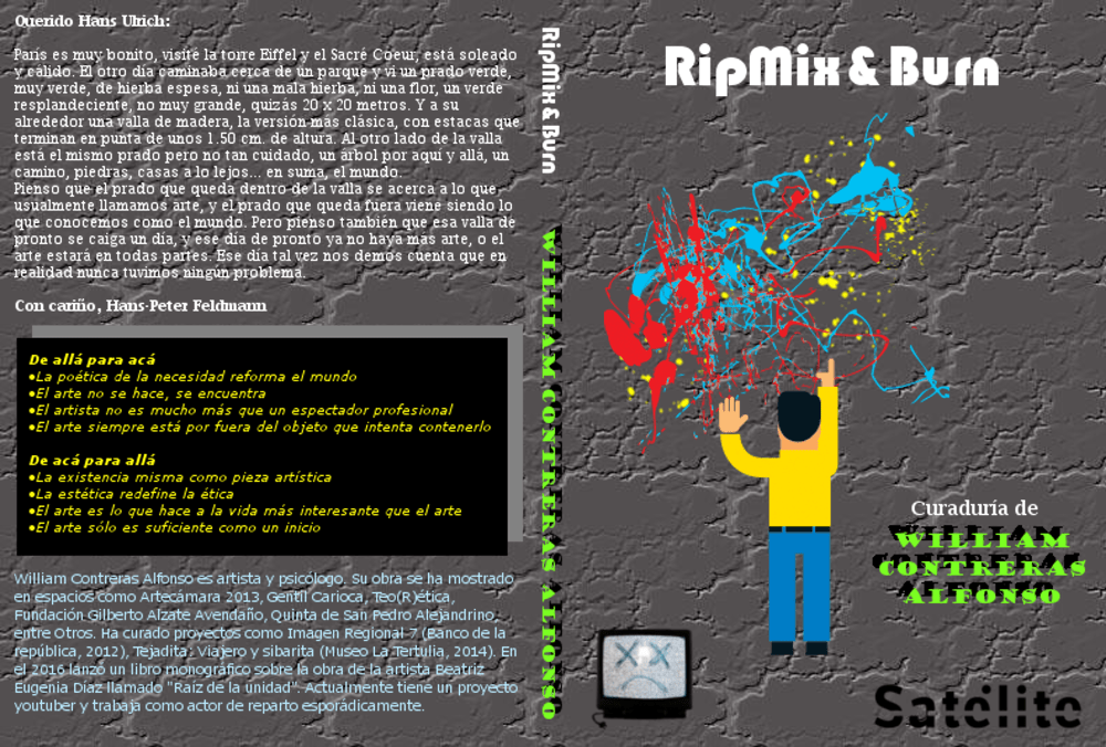 Para esta ocasión RipMix&Burn se realizó en colaboración con el proyecto Satélite, una iniciativa curatorial Mexicana que reflexiona y problematiza sobre la institución del museo. Se realizan acciones de manera autónoma e independiente a la programación de los museos y es a partir de un espíritu occupy y parasitario (ya que todas las piezas se concretan sólo en colaboración con los artistas, sin ningún permiso y/o presupuesto de los museos), que se generan interrogantes y apuntes sobre nuestra relación con dichas instituciones.