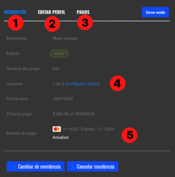 1- Encontrarás los detalles de tu membresía y en qué estado se encuentra. Allí también veras, abajo de todo los botones para cambiar y cancelar tu membresía. Si la cancelas seguirás teniendo acceso a los videos hasta la fecha que tengas pagada. Si quieres cambiar tu membresía a una categoría superior o inferior también puedes hacerlo.